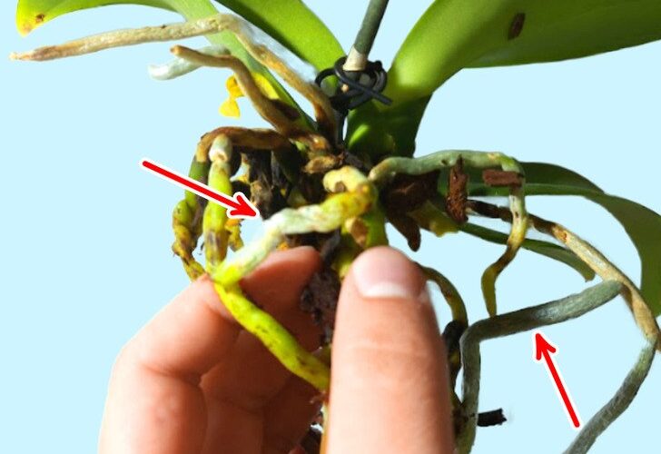 Com cuidado, retire a orquídea do vaso atual e verifique as raízes. Procure por raízes verdes e brancas. Mesmo que a planta não tenha mais folhas, as raízes ainda podem fazer fotossíntese, absorvendo nutrientes da água e do ar, o que pode revitalizar a planta.