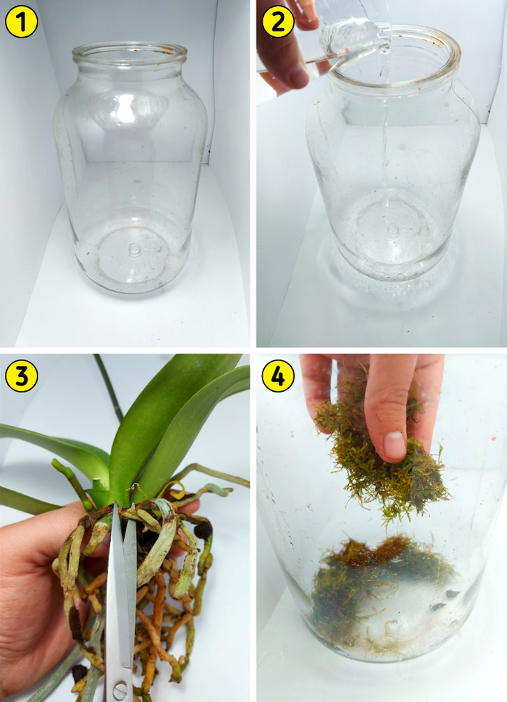 3. Em seguida, corte todas as raízes secas com tesouras desinfetadas e coloque a orquídea sobre o musgo.