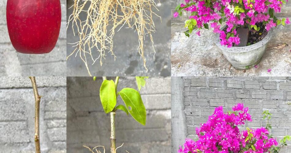 O efeito mágico de uma maçã para cortar bougainvillea e plantar flores em um pote de areia