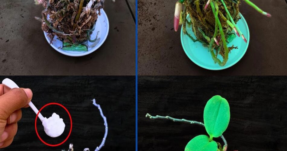 - Aplicação da magia: Com delicadeza, use a colher mágica para polvilhar uma mistura de composto orgânico nas raízes do orchid. Certifique-se de não cobrir completamente as raízes, mas alimentá-los cuidadosamente. É este polvilho mágico que ajudará o orchid a regenerar.